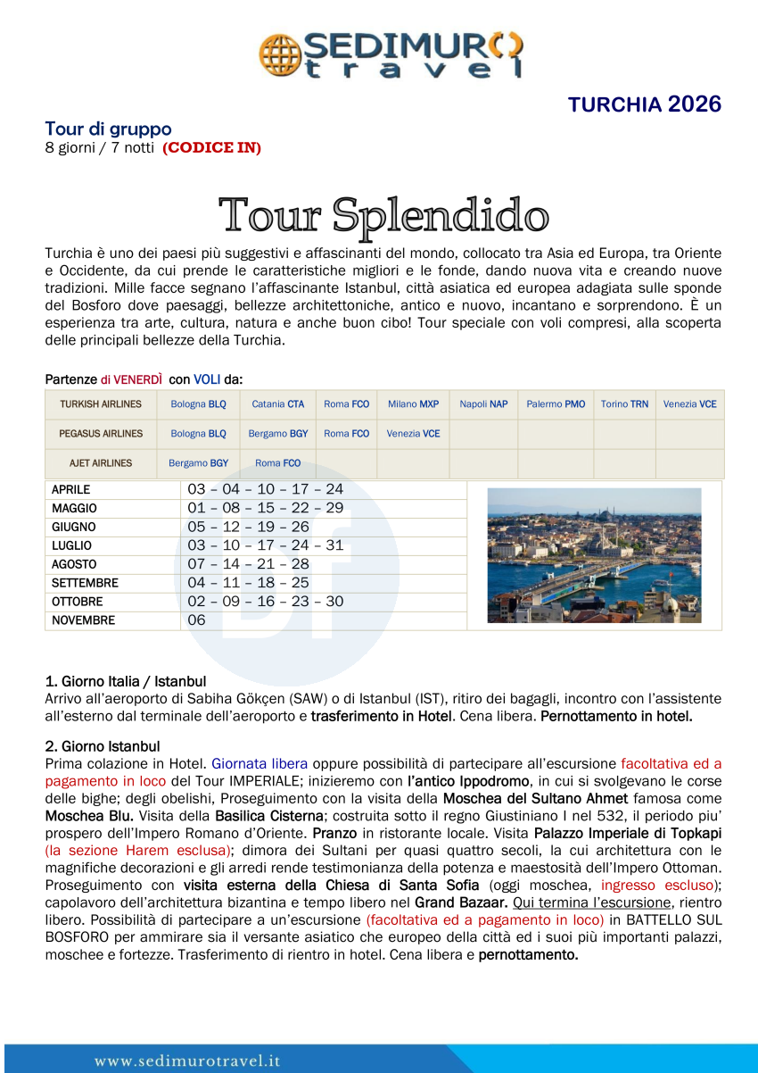 Tour Splendido con volo da bgy, blq, fco, vce, mxp, nap, cta, pmo, trn di venerdì 8 giorni